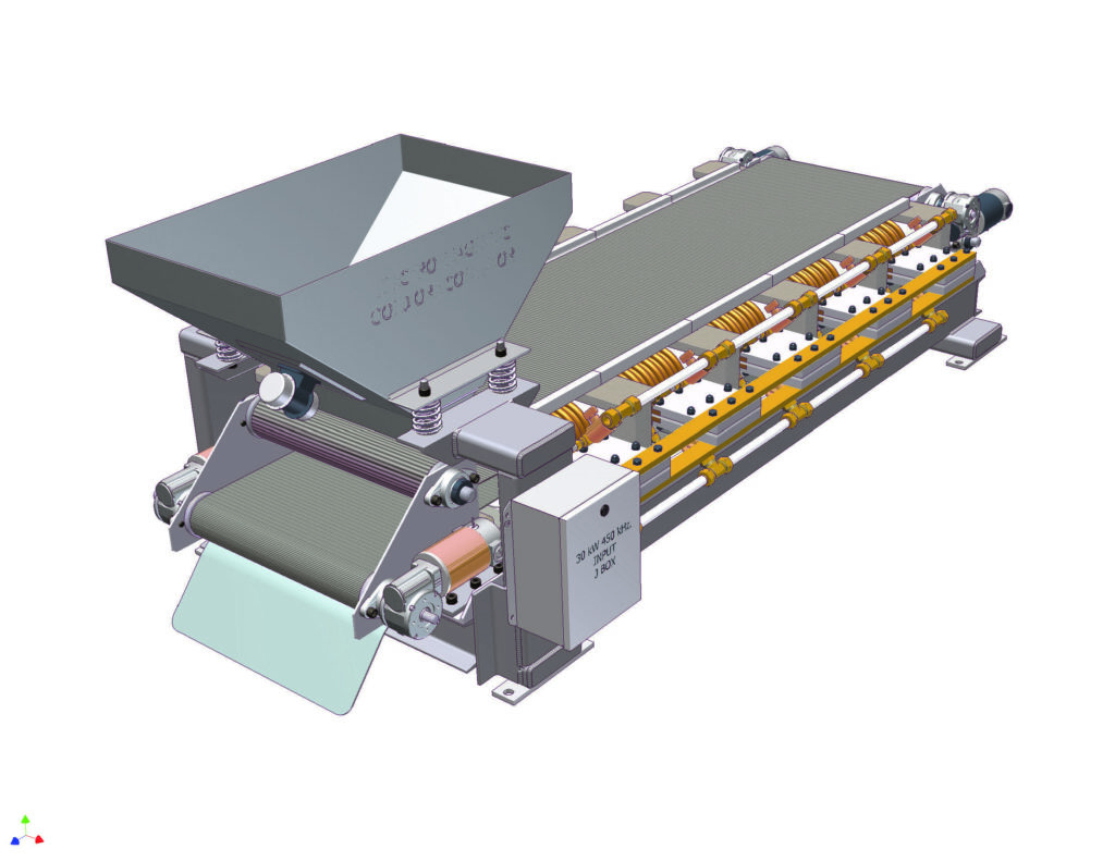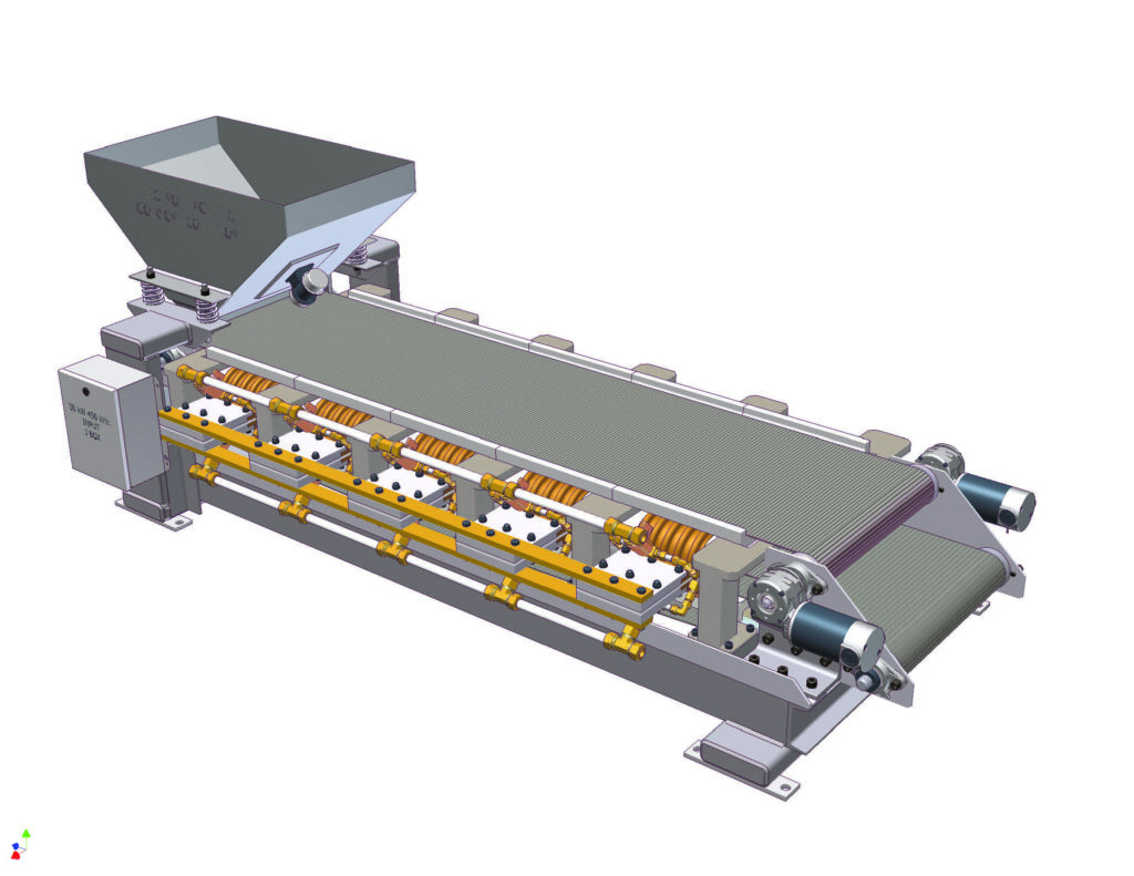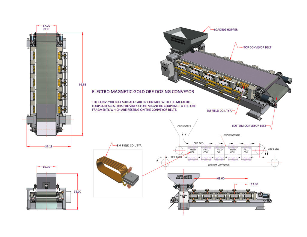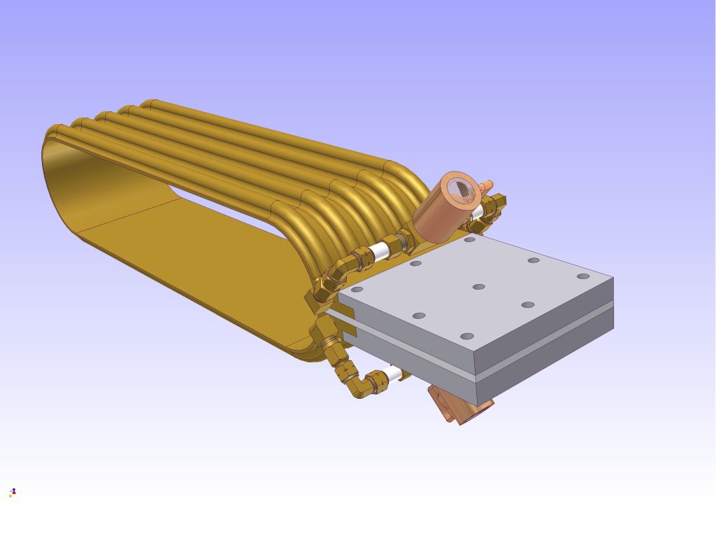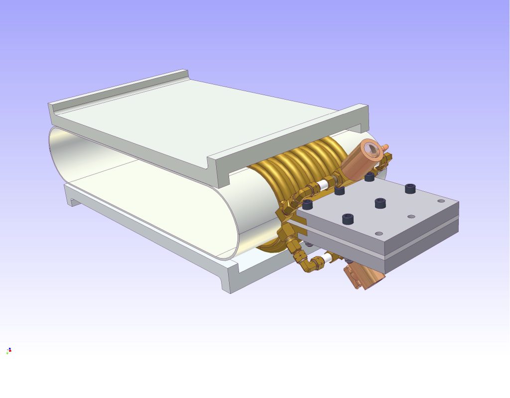 Here is the CAD model of the low frequency EM conductor coil with cooling tubing silver soldered to the flat conductor. This arrangement is easily capable of dissipating 10 kW of power at 330 kHz. The modules stack together lengthwise and provide the pathways for the conveyor belts holding the gold ore.
