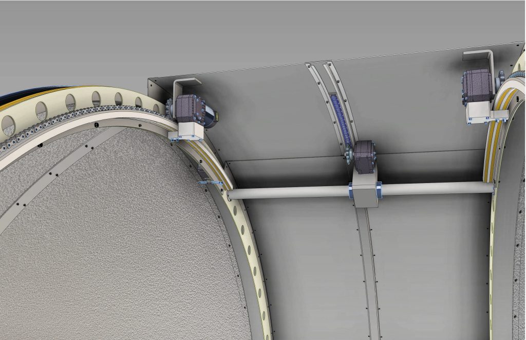 The roller chain is fastened to the bottom inside circumference of the dome wall and below the 24 VDC power buss track. The three gearmotors are fastened to the stationary walls. Their sprockets engaging the roller chain hold the dome to the wall securely.