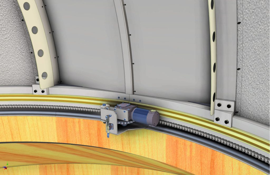 The dome sits on nylon rollers captured on a pipe track attached to the building wall and three sprockets engage the roller chain to fully constrain the dome to wall preventing vertical displacement in strong winds or storms.